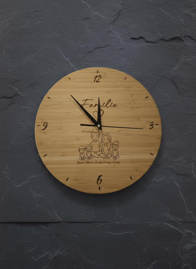 Elegante Wanduhr aus FSC®-zertifiziertem Bambus (Ø ca. 32 cm, 10-15 mm stark) mit individueller Lasergravur. Jede Uhr wird nach Wunsch mit Namen, Motiv oder Text personalisiert und ist damit ein einzigartiges Unikat – ideal als besonderes Geschenk für Familie, Freunde oder zu besonderen Anlässen. Das natürliche Bambusholz bringt Wärme und zeitlosen Stil in jedes Zuhause. Hergestellt von Swishly in Oldenburg, garantiert nachhaltig und hochwertig verarbeitet.