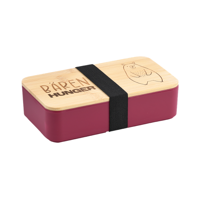 Die Brotdose „Bärenhunger“ von F. Anton Kesper GmbH ist ideal für Schule, Kindergarten oder unterwegs. Die Dose besteht aus robustem, lebensmittelechtem Kunststoff, während der Deckel aus FSC®-zertifiziertem Bambus gefertigt ist und durch den dekorativen Einbrand „Bärenhunger“ begeistert. Ein praktischer Gummiverschluss sorgt für einen sicheren Halt des Deckels.